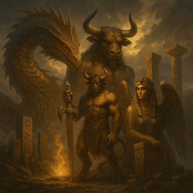 O Minotauro, metade homem e metade touro, habita um lugar especial na mitologia grega, no labirinto projetado pelo engenhoso Dédalo, na ilha de Creta. Fruto de uma maldição divina, essa criatura representa os aspectos mais primitivos e descontrolados da natureza humana. A batalha do herói Teseu contra o Minotauro simboliza a luta interna contra nossas próprias bestas interiores.